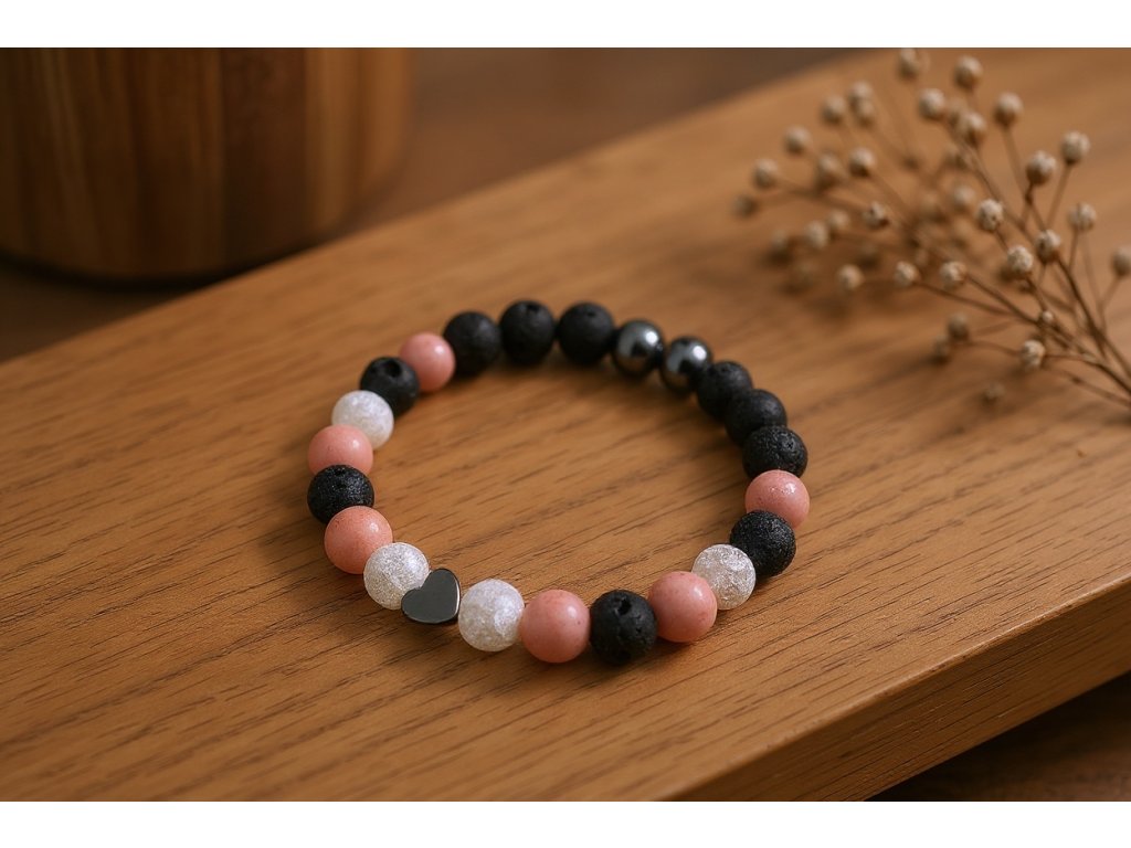 Náramek Alva je ručně vyráběný šperk z pečlivě vybraných přírodních minerálů, které spojují krásu, hloubku barev a jedinečný charakter. Nefrit svědčí o vyrovnanosti a klidu, vulkanická láva nabízí fascinující texturu a kontrast, zatímco křišťál přináší živost a třpyt do každého pohybu. Hematitové korálky a srdíčko podtrhují elegantní design a dodávají náramku osobitý šarm. Tento klenot je ideální pro každodenní nošení i jako smysluplný dárek pro vaše blízké.