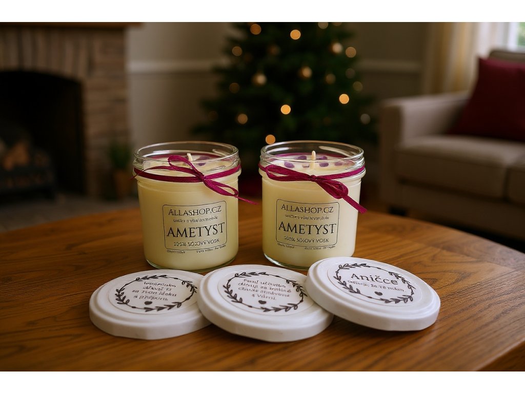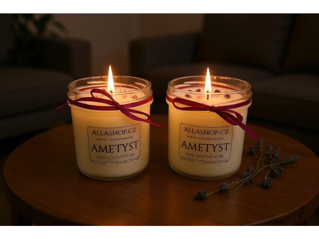Složení: 100% sójový vosk, krystaly ametystu a certifikované vonné oleje z přírodních a syntetických vonných látek.